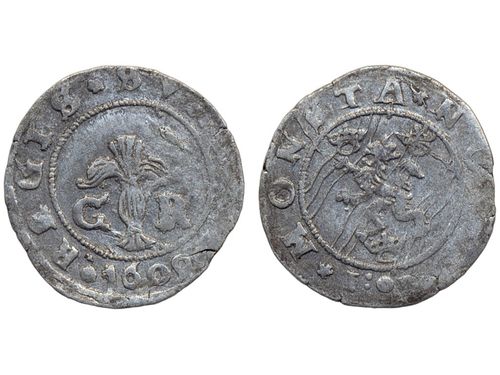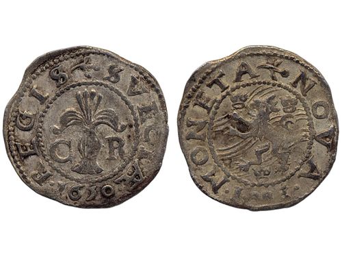 Coins, Sweden. Karl IX, SM 92b, 1 öre 1610/1010. 1.34 g. Göteborg. Reverse with date "1010" in legend. Cleaned, lighly bent. RRR. 1?/1. Coins, Sweden. Karl IX, SM 92b, 1 öre 1610/1010. 1.34 g. Göteborg. Reverse with date "1010" in legend. Cleaned, lighly bent. RRR. 1?/1. Visa mindre