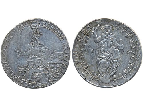 Coins, Sweden. Karl IX, SM 26a, 1 riksdaler 1610. 29.08 g. Stockholm. Planchet flaws, has been mounted, cleaned. 1. Coins, Sweden. Karl IX, SM 26a, 1 riksdaler 1610. 29.08 g. Stockholm. Planchet flaws, has been mounted, cleaned. 1. Visa mindre