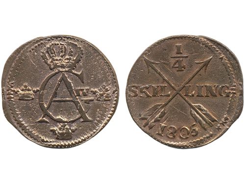Coins, Sweden. Gustav IV Adolf, SM 59, ¼ skilling 1805. 7.20 g. Avesta. Reverse double struck! Interesting mint error. 01/0. Coins, Sweden. Gustav IV Adolf, SM 59, ¼ skilling 1805. 7.20 g. Avesta. Reverse double struck! Interesting mint error. 01/0. Visa mindre