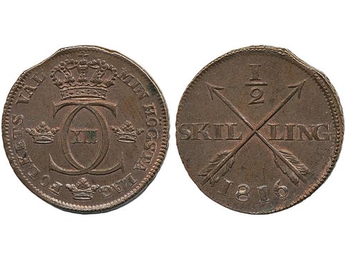 Coins, Sweden. Karl XIII, SM 41, ½ skilling 1816. 17.96 g. Avesta. Minor edge clip from production. Hints of lustre. Ex. MISAB 19 lot 530. 01. Coins, Sweden. Karl XIII, SM 41, ½ skilling 1816. 17.96 g. Avesta. Minor edge clip from production. Hints of lustre. Ex. MISAB 19 lot 530. 01. Visa mindre