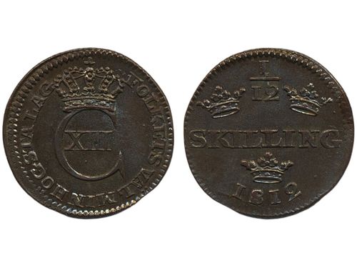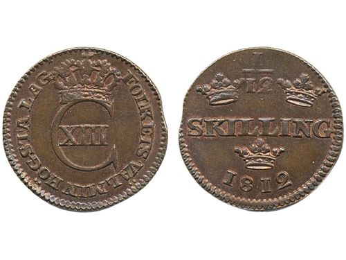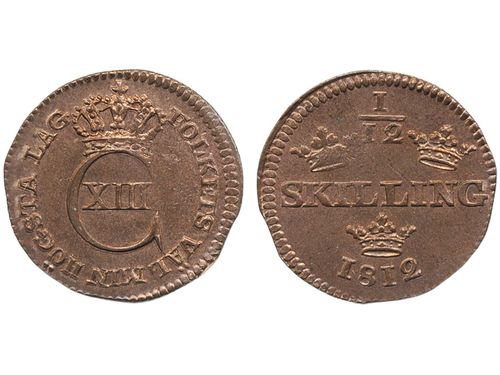 Coins, Sweden. Karl XIII, SM 44a, 1/12 skilling 1812. 2.22 g. Avesta. Much red lustre, minor edge clip from production. 01/0. Coins, Sweden. Karl XIII, SM 44a, 1/12 skilling 1812. 2.22 g. Avesta. Much red lustre, minor edge clip from production. 01/0. Visa mindre