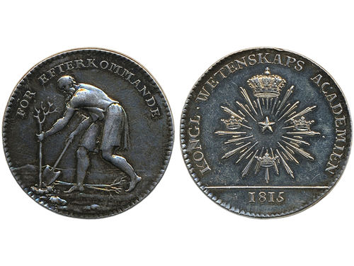 Medals, regal, Sweden. Karl XIII, Hild. 35, Royal Swedish Academy of Sciences. Jetton 1815 in silver, 33 mm, 12.5 g. by.. Läs mer Medals, regal, Sweden. Karl XIII, Hild. 35, Royal Swedish Academy of Sciences. Jetton 1815 in silver, 33 mm, 12.5 g. by M. Frumerie. Small edge nick. Nice rainbow-like patina. Delzanno 41. 01. Visa mindre