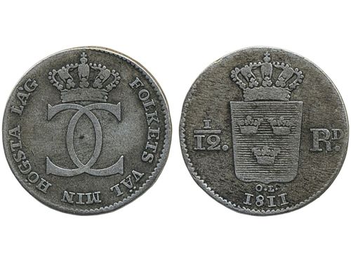 Coins, Sweden. Karl XIII, SM 24, 1/12 riksdaler 1811. 4.29 g. Stockholm. One year type. 1/1+. Coins, Sweden. Karl XIII, SM 24, 1/12 riksdaler 1811. 4.29 g. Stockholm. One year type. 1/1+. Visa mindre