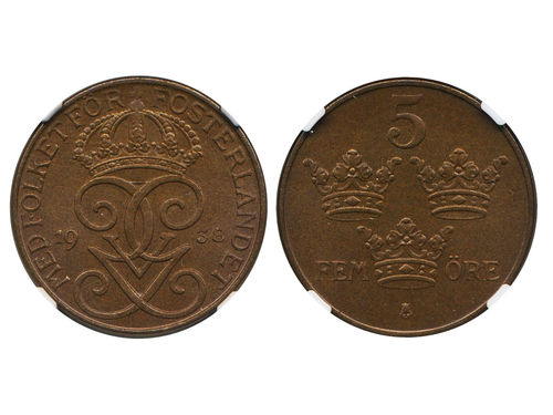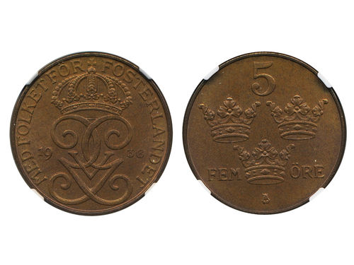 Coins, Sweden. Gustav V, MIS I.27a, 5 öre 1936. Short 6. Graded MS65 BN by NGC. 01/0. See certification at NGC Coins, Sweden. Gustav V, MIS I.27a, 5 öre 1936. Short 6. Graded MS65 BN by NGC. 01/0. See certification at NGC Visa mindre
