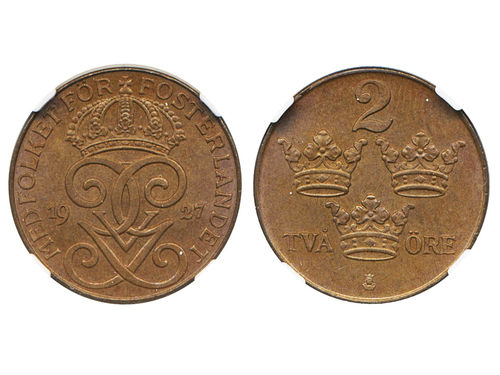 Coins, Sweden. Gustav V, MIS I.16, 2 öre 1927. Graded MS65 BN by NGC. 01/0. See certification at NGC Coins, Sweden. Gustav V, MIS I.16, 2 öre 1927. Graded MS65 BN by NGC. 01/0. See certification at NGC Visa mindre