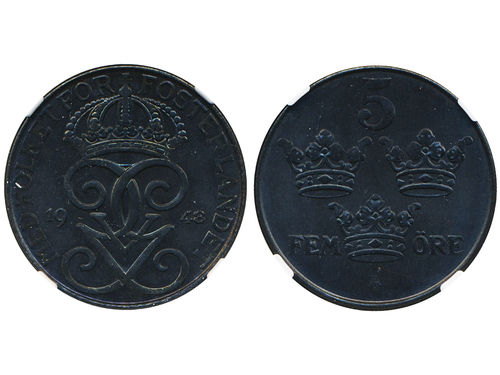 Coins, Sweden. Gustav V, MIS II.11, 5 öre 1948. Graded by NGC as MS66. 0. See certification at NGC Coins, Sweden. Gustav V, MIS II.11, 5 öre 1948. Graded by NGC as MS66. 0. See certification at NGC Visa mindre