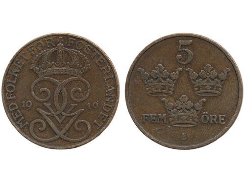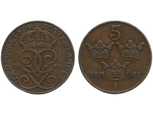Coins, Sweden. Gustav V, MIS I.2, 5 öre 1910. 1. Coins, Sweden. Gustav V, MIS I.2, 5 öre 1910. 1. Visa mindre