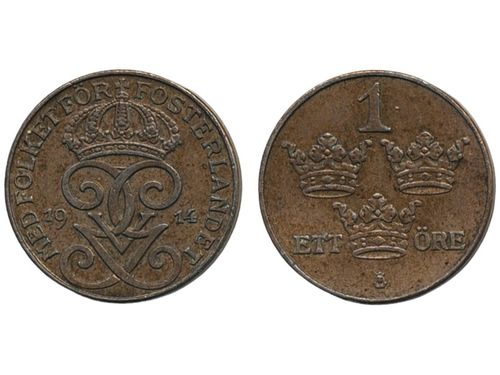 Coins, Sweden. Gustav V, MIS I.6b, 1 öre 1914. Open 4. 1+/01. Coins, Sweden. Gustav V, MIS I.6b, 1 öre 1914. Open 4. 1+/01. Visa mindre