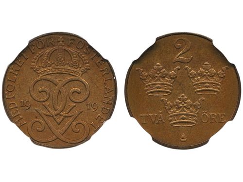 Coins, Sweden. Gustav V, MIS I.8, 2 öre 1919. Graded MS65 BN by NGC. 01/0. See certification at NGC Coins, Sweden. Gustav V, MIS I.8, 2 öre 1919. Graded MS65 BN by NGC. 01/0. See certification at NGC Visa mindre