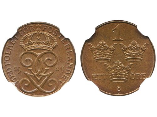 Coins, Sweden. Gustav V, MIS I.19a, 1 öre 1929. Curved 2. Graded MS65 BN by NGC. 01/0. See certification at NGC Coins, Sweden. Gustav V, MIS I.19a, 1 öre 1929. Curved 2. Graded MS65 BN by NGC. 01/0. See certification at NGC Visa mindre