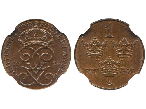 Coins, Sweden. Gustav V, MIS I.18, 1 öre 1928. Graded MS65 BN by NGC. 01/0. See certification at NGC Coins, Sweden. Gustav V, MIS I.18, 1 öre 1928. Graded MS65 BN by NGC. 01/0. See certification at NGC Visa mindre