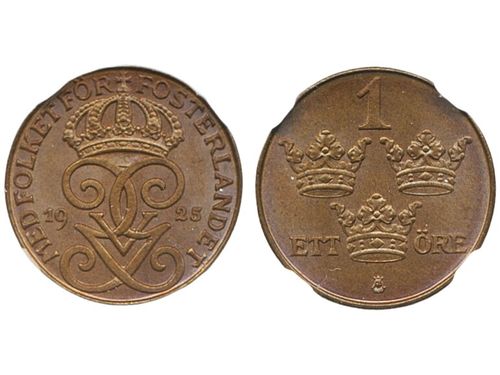 Coins, Sweden. Gustav V, MIS I.15, 1 öre 1925. Graded MS65 BN by NGC. 01/0. See certification at NGC Coins, Sweden. Gustav V, MIS I.15, 1 öre 1925. Graded MS65 BN by NGC. 01/0. See certification at NGC Visa mindre