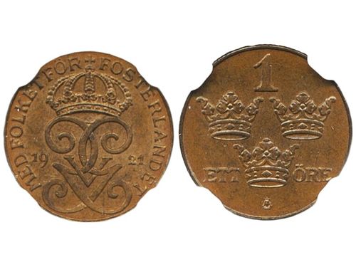 Coins, Sweden. Gustav V, MIS I.11, 1 öre 1921. Graded MS65 BN by NGC. 01/0. See certification at NGC Coins, Sweden. Gustav V, MIS I.11, 1 öre 1921. Graded MS65 BN by NGC. 01/0. See certification at NGC Visa mindre