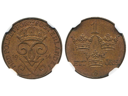 Coins, Sweden. Gustav V, MIS I.6b, 1 öre 1914. Open 4. Graded MS64 BN by NGC. 01/0. See certification at NGC Coins, Sweden. Gustav V, MIS I.6b, 1 öre 1914. Open 4. Graded MS64 BN by NGC. 01/0. See certification at NGC Visa mindre