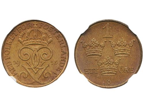 Coins, Sweden. Gustav V, MIS I.7a, 1 öre 1915. Graded MS64 BN by NGC. 01/0. See certification at NGC Coins, Sweden. Gustav V, MIS I.7a, 1 öre 1915. Graded MS64 BN by NGC. 01/0. See certification at NGC Visa mindre