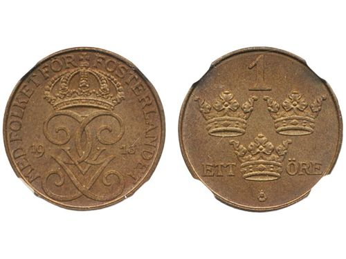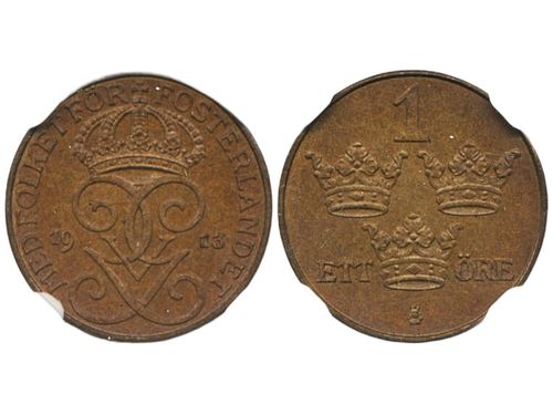 Coins, Sweden. Gustav V, MIS I.5b, 1 öre 1913. Graded MS64 BN by NGC. 01/0. See certification at NGC Coins, Sweden. Gustav V, MIS I.5b, 1 öre 1913. Graded MS64 BN by NGC. 01/0. See certification at NGC Visa mindre