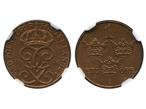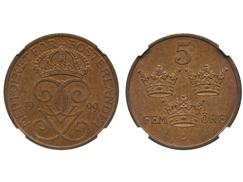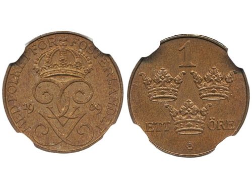Coins, Sweden. Gustav V, MIS I.1e, 1 öre 1909. Graded by NGC as MS65 BN. 01/0. See certification at NGC Coins, Sweden. Gustav V, MIS I.1e, 1 öre 1909. Graded by NGC as MS65 BN. 01/0. See certification at NGC Visa mindre