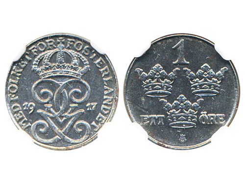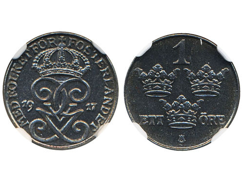 Coins, Sweden. Gustav V, MIS II.1, 1 öre 1917. Graded by NGC as MS64. 01/0. See certification at NGC Coins, Sweden. Gustav V, MIS II.1, 1 öre 1917. Graded by NGC as MS64. 01/0. See certification at NGC Visa mindre