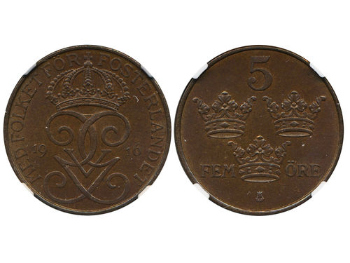 Coins, Sweden. Gustav V, MIS I.2, 5 öre 1910. 1/1+. Coins, Sweden. Gustav V, MIS I.2, 5 öre 1910. 1/1+. Visa mindre