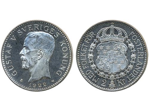 Coins, Sweden. Gustav V, MIS I.7, 2 kronor 1922. Mirror-like surfaces. 01/0. Coins, Sweden. Gustav V, MIS I.7, 2 kronor 1922. Mirror-like surfaces. 01/0. Visa mindre