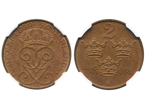 Coins, Sweden. Gustav V, MIS I.2, 2 öre 1910. Graded by NGC as MS65 BN. 0. See certification at NGC Coins, Sweden. Gustav V, MIS I.2, 2 öre 1910. Graded by NGC as MS65 BN. 0. See certification at NGC Visa mindre