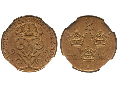 Coins, Sweden. Gustav V, MIS I.7c, 2 öre 1916. Long 6. Graded by NGC as MS64 BN. 01/0. See certification at NGC Coins, Sweden. Gustav V, MIS I.7c, 2 öre 1916. Long 6. Graded by NGC as MS64 BN. 01/0. See certification at NGC Visa mindre
