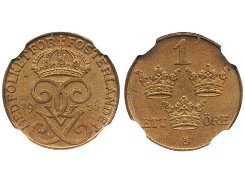 Coins, Sweden. Gustav V, MIS I.8b, 1 öre 1916. Long 6. Graded by NGC as MS64 BN. 01/0. See certification at NGC Coins, Sweden. Gustav V, MIS I.8b, 1 öre 1916. Long 6. Graded by NGC as MS64 BN. 01/0. See certification at NGC Visa mindre