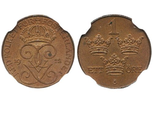 Coins, Sweden. Gustav V, MIS I.4b, 1 öre 1912. Graded by NGC as MS64 BN. 01/0. See certification at NGC Coins, Sweden. Gustav V, MIS I.4b, 1 öre 1912. Graded by NGC as MS64 BN. 01/0. See certification at NGC Visa mindre