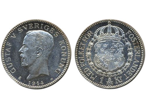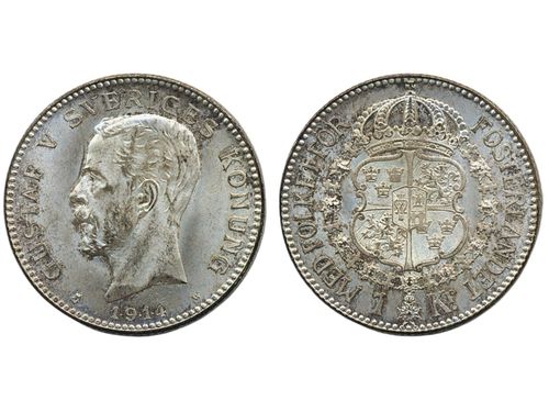 Coins, Sweden. Gustav V, MIS I.4a, 1 krona 1914. 01/0. Coins, Sweden. Gustav V, MIS I.4a, 1 krona 1914. 01/0. Visa mindre