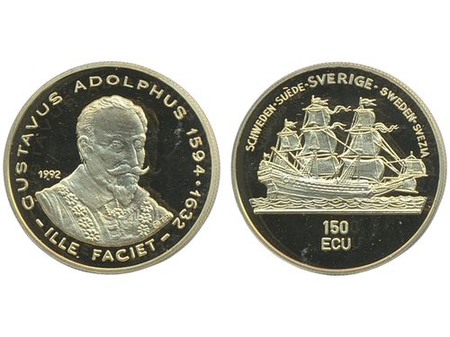 Coins, Sweden. Carl XVI Gustaf, KM X#13, 150 ECU 1992. 6.72 g, Gustavus Adolphus 1594–1632. 0. Mintage: 1000. Coins, Sweden. Carl XVI Gustaf, KM X#13, 150 ECU 1992. 6.72 g, Gustavus Adolphus 1594–1632. 0. Mintage: 1000. Visa mindre