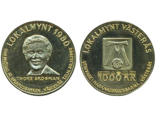 Coins, Sweden. Carl XVI Gustaf, 1000 kronor local coin 1980. 10.06 g, 18 K gold, Västerås 1000 kronor, Thore Skogman 1980. 01. Coins, Sweden. Carl XVI Gustaf, 1000 kronor local coin 1980. 10.06 g, 18 K gold, Västerås 1000 kronor, Thore Skogman 1980. 01. Visa mindre
