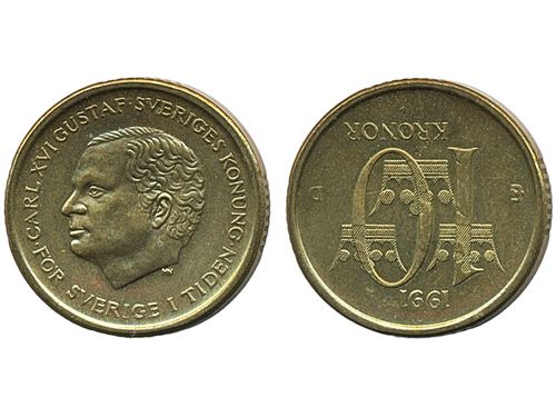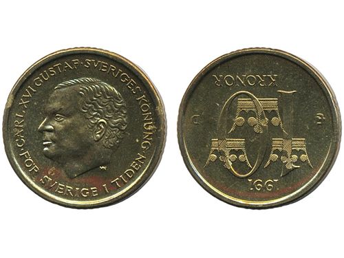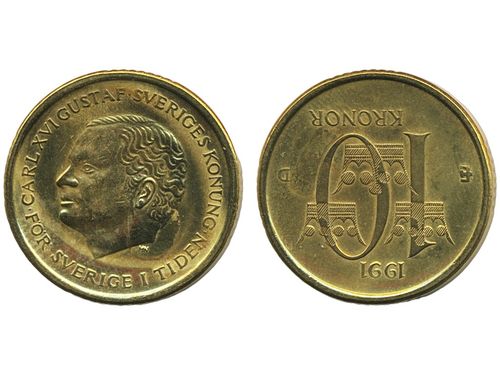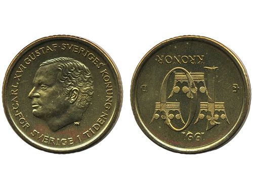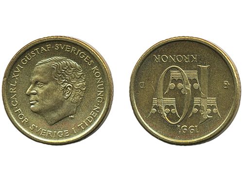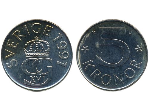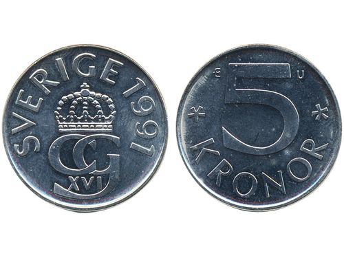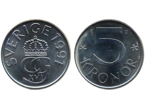 Coins, Sweden. Carl XVI Gustaf, MIS I.16, 5 kronor 1991. Mm U. Beautiful example with only the slightest handling marks. 01/0. Coins, Sweden. Carl XVI Gustaf, MIS I.16, 5 kronor 1991. Mm U. Beautiful example with only the slightest handling marks. 01/0. Visa mindre