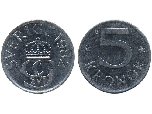 Coins, Sweden. Carl XVI Gustaf, MIS I.7, 5 kronor 1982. Struck on a thin planchet, weight only 5.00g. Interesting mint error! 01/0. Coins, Sweden. Carl XVI Gustaf, MIS I.7, 5 kronor 1982. Struck on a thin planchet, weight only 5.00g. Interesting mint error! 01/0. Visa mindre