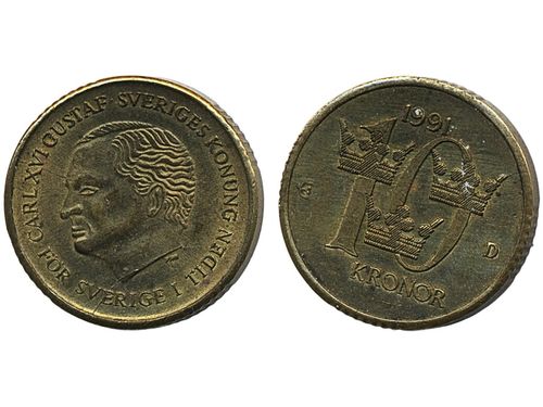 Coins, Sweden. Carl XVI Gustaf, MIS I.1b, 10 kronor 1991. Reverse rotated 180. 01/0. Coins, Sweden. Carl XVI Gustaf, MIS I.1b, 10 kronor 1991. Reverse rotated 180. 01/0. Visa mindre