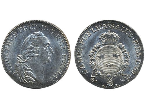 Coins, Sweden. Adolf Fredrik, SM 78, 1/8 riksdaler 1768. 3.67 g. Stockholm. Some adjustment marks. Lustrous and attractive. 01/0. Coins, Sweden. Adolf Fredrik, SM 78, 1/8 riksdaler 1768. 3.67 g. Stockholm. Some adjustment marks. Lustrous and attractive. 01/0. Visa mindre
