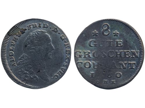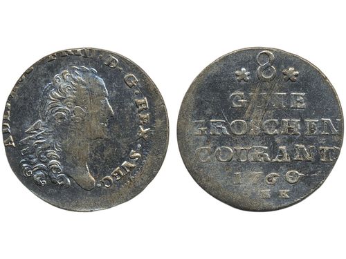 Coins, Swedish possessions, Pomerania. Adolf Fredrik, SB 246, 8 gute groschen 1760. 6.96 g. Stralsund. Weakly struck, ad.. Läs mer Coins, Swedish possessions, Pomerania. Adolf Fredrik, SB 246, 8 gute groschen 1760. 6.96 g. Stralsund. Weakly struck, adjustment marks. Somewhat cleaned. 1+/01. Visa mindre