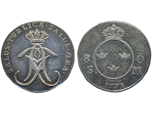 Coins, Sweden. Adolf Fredrik, SM 79b, 8 öre silvermynt (1/12 riksdaler) 1771. 4.11 g. Stockholm. One year type. Angle be.. Läs mer Coins, Sweden. Adolf Fredrik, SM 79b, 8 öre silvermynt (1/12 riksdaler) 1771. 4.11 g. Stockholm. One year type. Angle below the transversal stroke in A. Rubbed, tooled. Scarce! 1+/Good 1+. Visa mindre