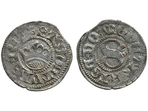 Coins, Sweden. Sten Sture den yngre, LL 9e var, ½ örtug ND. 0.90 g. Stockholm. Crown, STEN+STVRE+RIT)(MONETA+STOC+HO, S.. Läs mer Coins, Sweden. Sten Sture den yngre, LL 9e var, ½ örtug ND. 0.90 g. Stockholm. Crown, STEN+STVRE+RIT)(MONETA+STOC+HO, S with rose at right. Somewhat irregular planchet. SMB 494. 1+. Visa mindre